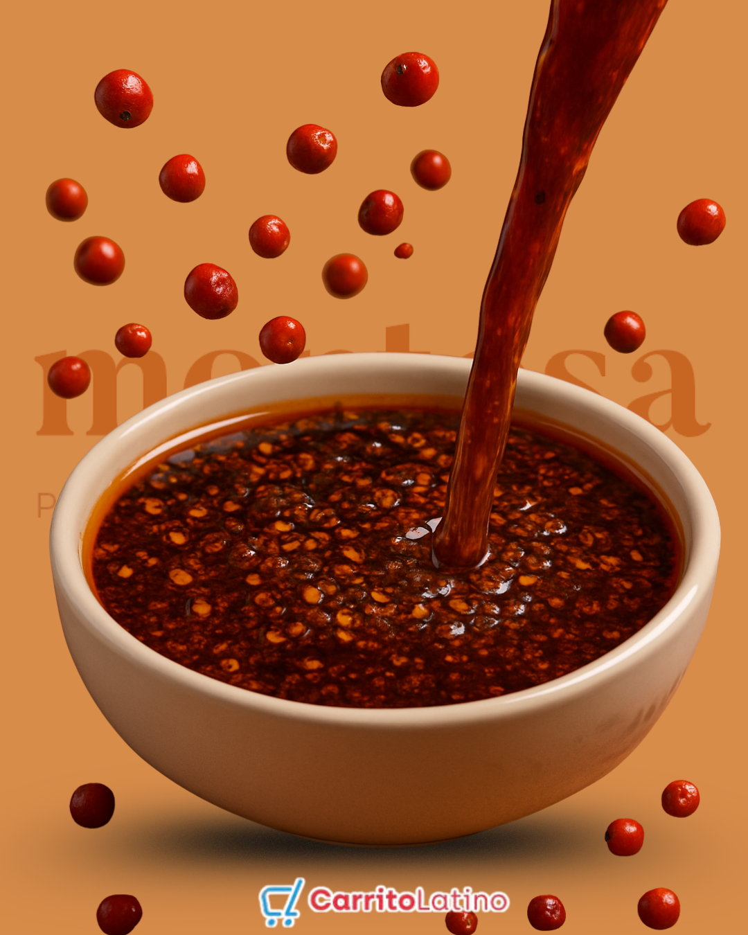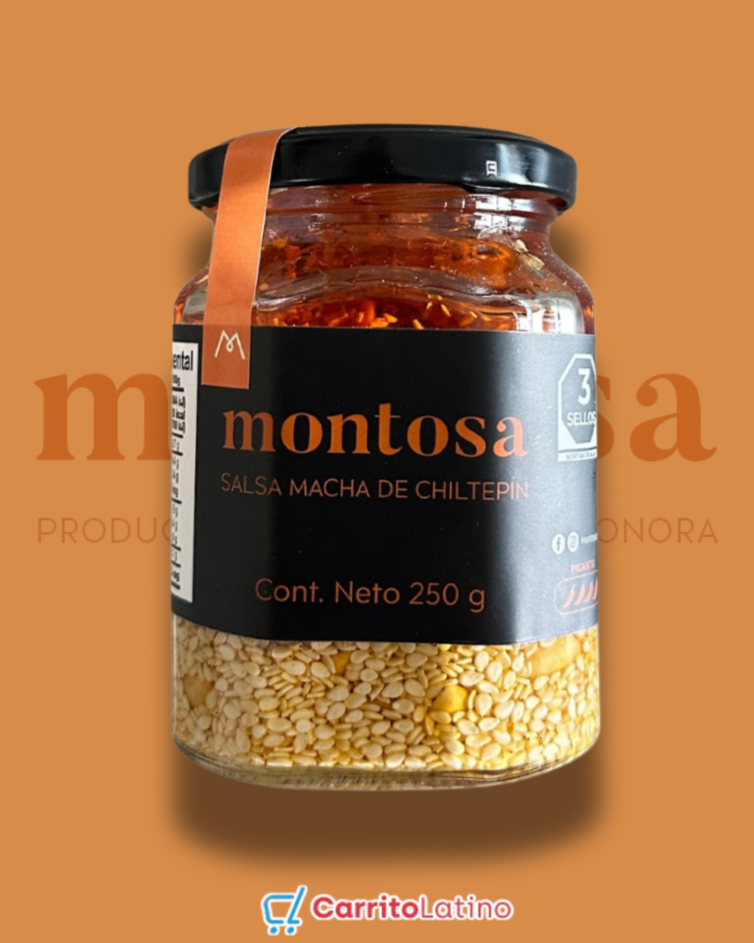 Made from Chiltepín chili, chile de árbol, almond, olive oil, pumpkin seeds, peanuts, sesame seeds and spices. Presented in 250g container